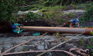 Durante uma inspeção, os técnicos identificaram que um trecho da tubulação de esgoto, instalado em um barranco de difícil acesso, estava completamente obstruído por raízes de árvores. Para alcançar o ponto danificado e executar o serviço com segurança, foi necessário o uso de equipamentos de rapel.