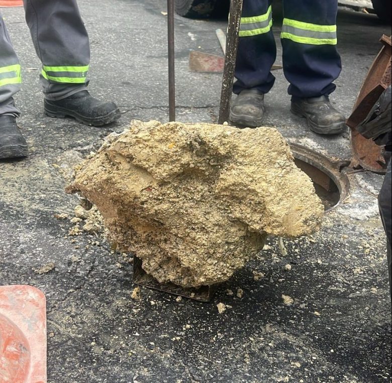 Um caso emblemático aconteceu também no Méier, na Rua Silva Rabelo. Durante um serviço de desobstrução, técnicos encontraram um enorme bloco de óleo solidificado, resultado do descarte irregular de gordura por restaurantes da região. O material, que somava cerca de 60 quilos, tinha consistência semelhante ao concreto e precisou ser removido em partes.