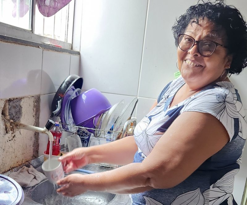 “Moro aqui há quase duas décadas e sempre sofri com a falta de água. Precisava passar a noite enchendo baldes e garrafas, porque só caía um filete na bica externa de vez em quando. Para beber, comprava galões, o que pesava no bolso. Muitas vezes precisei ir à casa da minha filha para conseguir tomar banho. Hoje, poder usar meu chuveiro com tranquilidade é motivo de grande alegria”, contou, emocionada.